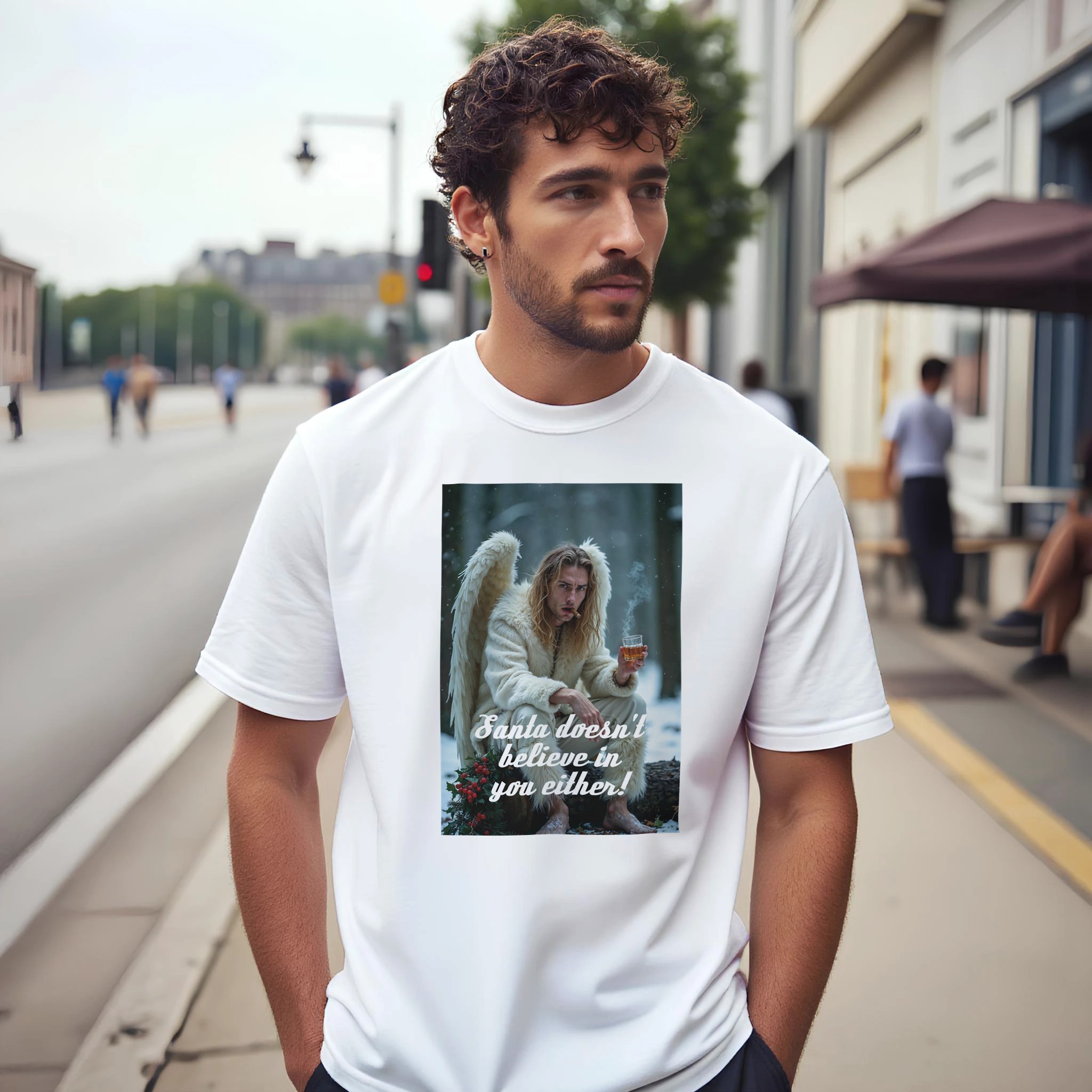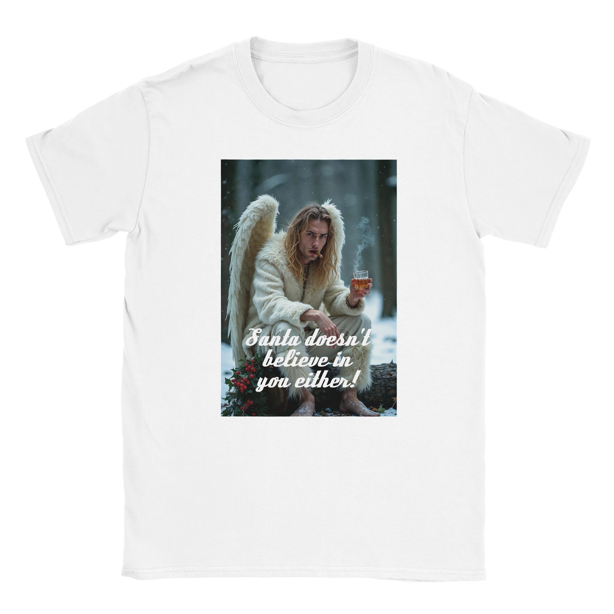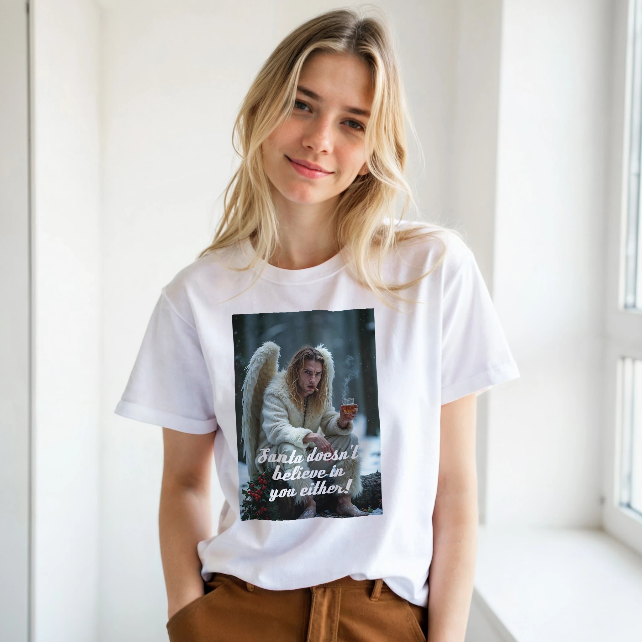 - Front motif: grumpy angel in winter woods with bold caption “Santa doesn’t believe in you either!”